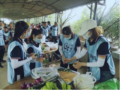 蓝蓝天空,美得不像话吧!大家的心情也像这明媚的阳光一样,到了拓展场地第一件事就是集合,看着一列列方阵多么地整齐,这就是今年会人的风貌!随后营销总监兼拓展教练沈总介绍了上午的拓展任务,厨艺大比拼!当沈总说开始的话音刚落,六支队伍的队员顷刻间化整为零,有的去准备食材、有的拿起锅勺化身大厨、有的点燃烤炉摇身一变成为全场最火热的那个人,场面一下子热闹起来。