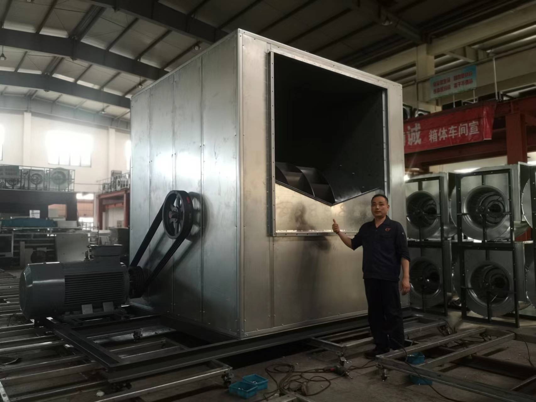 HTFC-V-16是公司成立以来最大的箱体风机。为了保质保量的按时完成HTFC-V-16,车间上下全体成员积极响应公司号召,发扬不怕苦、不怕累的精神,以高昂的斗志迎接新挑战。尤其是我们箱体车间的兄弟们。因为他们不仅需要担当自己生产任务,而且还要完成研发组装新型HTFC-V-16全部任务。