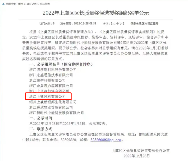 2022年12月,2022年上虞区区长质量奖候选授奖企业名单公示结果显示,今年会风机荣登榜单,获得2022年上虞区区长质量奖候选授奖。