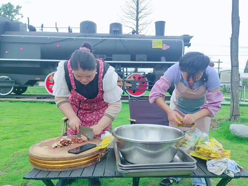 团建现场热闹非凡!有的乘坐“海潮号”在白马湖中肆意驰骋,有的在“0918”号列车前打卡留念,有的在天幕大草帽下唠唠家常,有的在精心调制独家秘制烧烤……一直到太阳西斜。