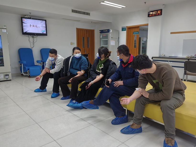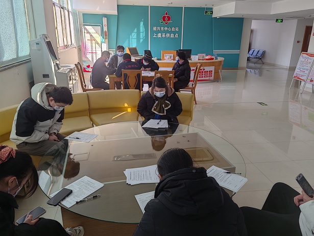 下午13:30,在绍兴市中心血站上虞采供血点,前来献血的员工按照工作人员的指引有序进行着填表、量血压、验血等流程。
